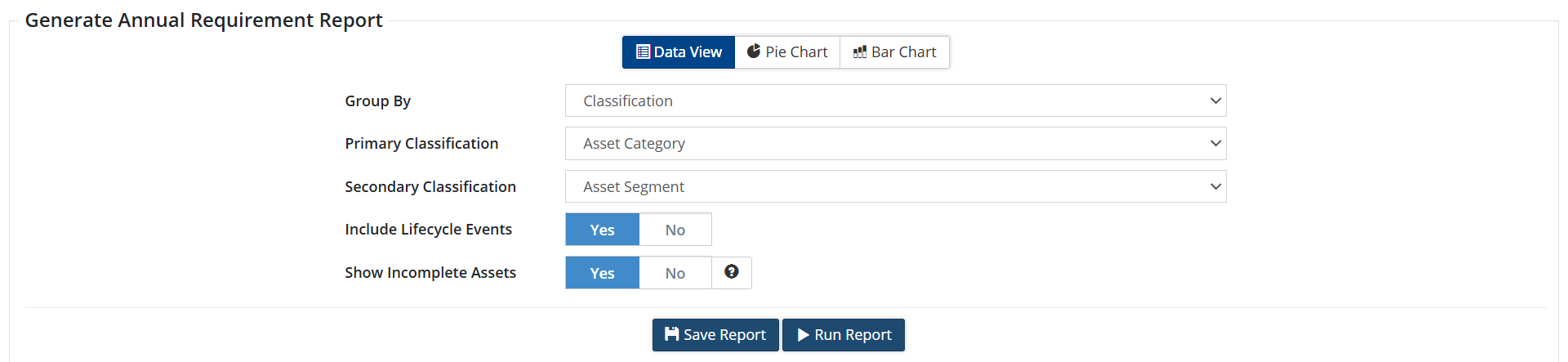 The Annual Requirement report provides a summary of the annual dollar requirement needed to maintain infrastructure.  The report can also include Lifecycle events.  To report on the annual requirement of assets: